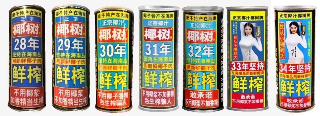 椰树老板的第二个特点,就是很固执,但凡你怎么说他都不改自己的审美,产品外包装30年如一日,自我感觉非常良好,每年所谓的更新包装几乎就是改个数字就完事,画风从未变过。