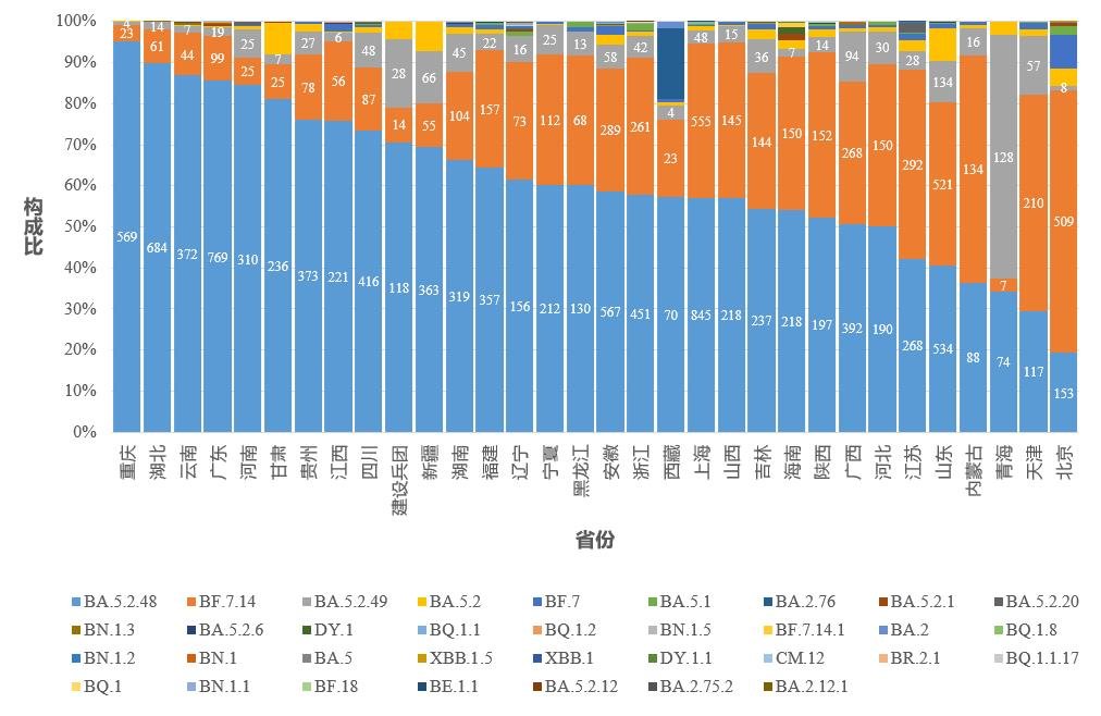 2.图中标记的数字分别为BA.5.2.48、BF.7.14和BA.5.2.49进化分支有效基因组序列数量。