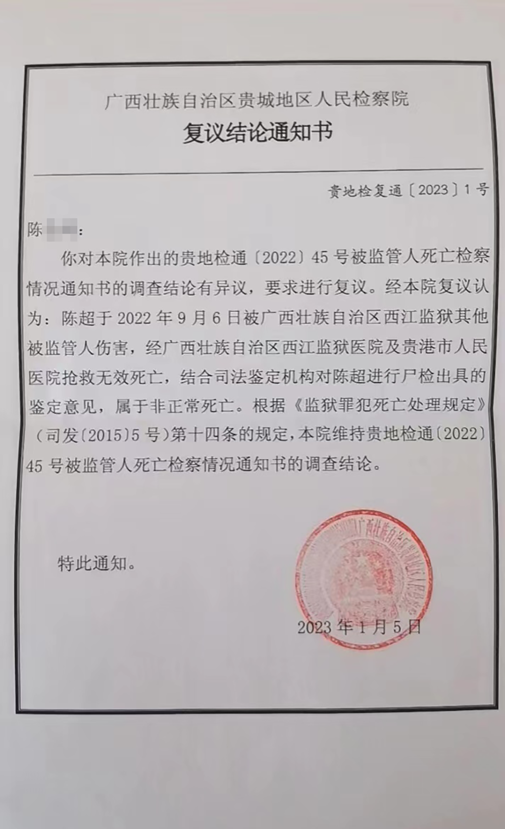 同年10月,贵城地区检察院出具《被监管人死亡检察情况通知书》显示,陈超于2022年9月6日被西江监狱其他被监管人伤害,经西江监狱医院以及贵港市人民医院抢救无效死亡,属于非正常死亡。
