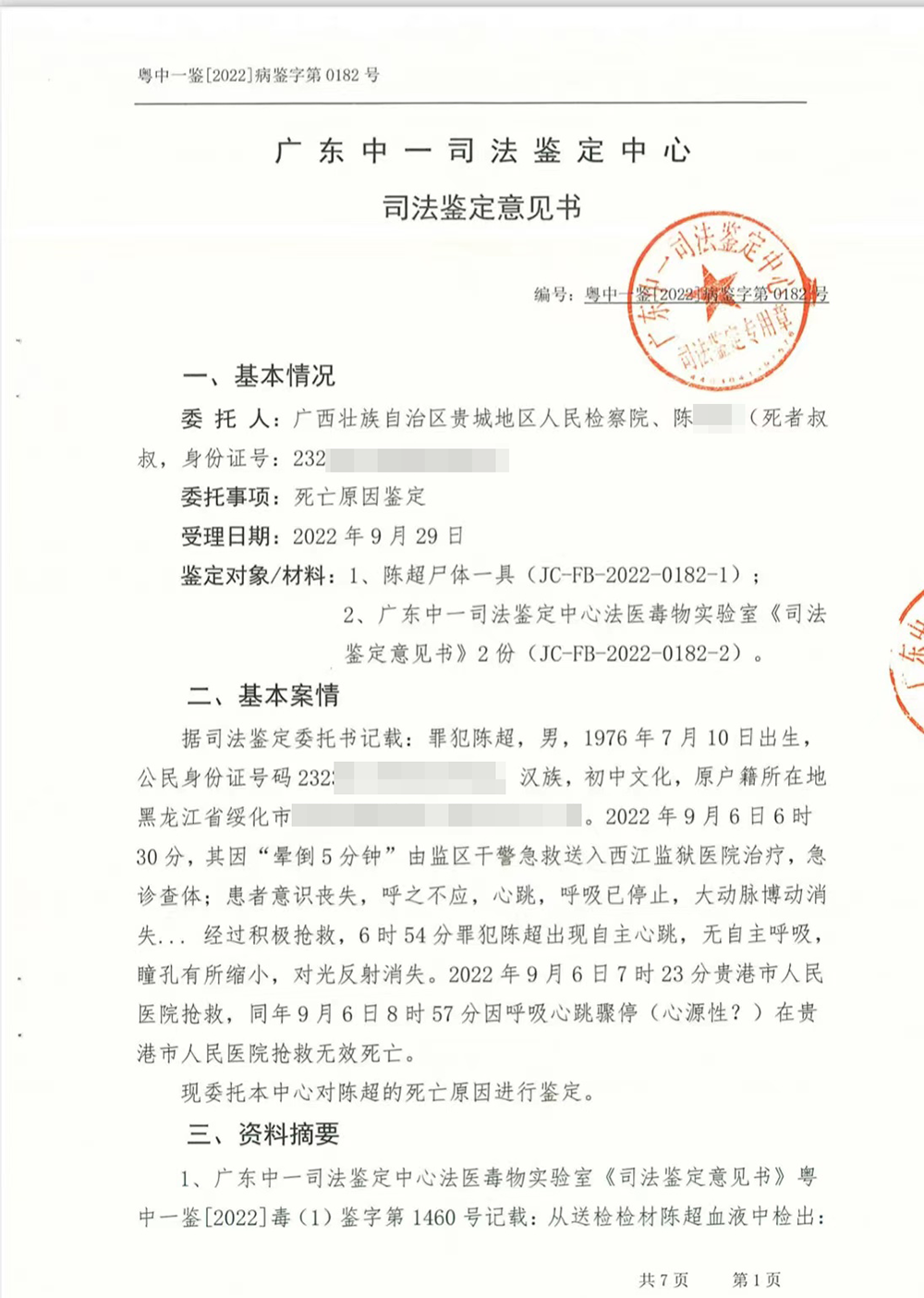 2022年10月,广东中一司法鉴定中心出具鉴定意见书。该鉴定意见书在“基本案情”中写道,“2022年9月6日6时30分,其(指陈超)因‘晕倒5分钟’由监区干警急救送入西江监狱医院治疗,急诊查体;患者意识丧失,呼之不应,心跳,呼吸已停止,大动脉博动消失.。经过积极抢救,6时54分罪犯陈超出现自主心跳,无自主呼吸,瞳孔有所缩小,对光反射消失。7时23分贵港市人民医院抢救,8时57分因呼吸心跳骤停(心源性?)在贵港市人民医院抢救无效死亡。”