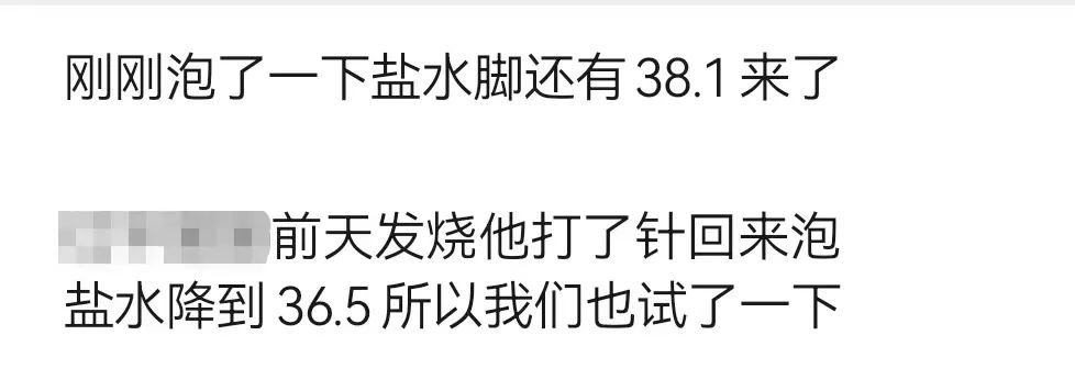 而第三天还没退烧的爸妈,突然支棱起来,称要用半包盐来泡脚。据说,一位亲戚去医院打完吊瓶后,回家用了一整包盐泡脚,当晚就退烧了。