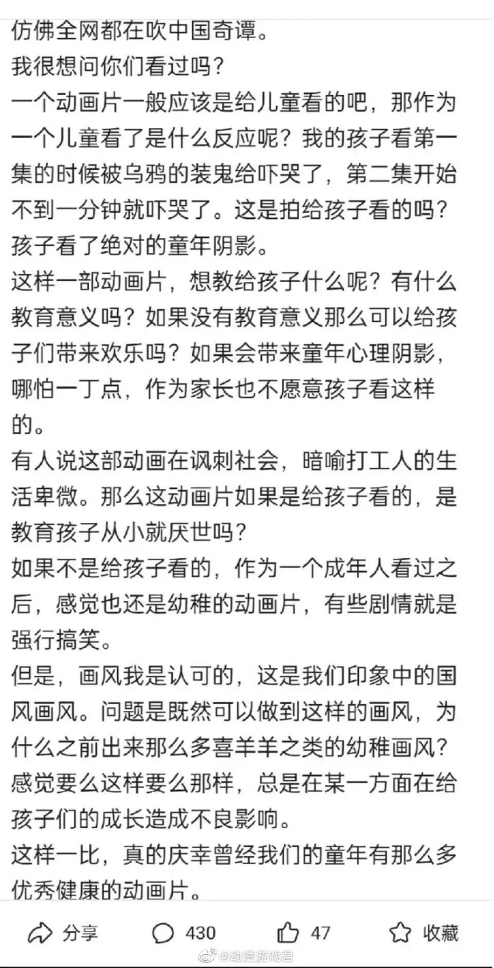 《中国奇谭》中某些故事和画风也许“少儿不宜”,但那种阴私而暗黑的批斗欲,那种剥夺他人创作自由也无视自己选择自由的强迫欲,真的成人也不宜。真不知,这种家长能教出啥样孩子来……