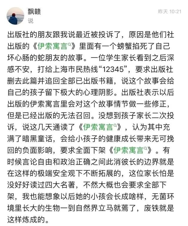 这件事让我联想起了去年的一桩旧闻:某家长连续反复举报《伊索寓言》,最终导致其被迫下架: