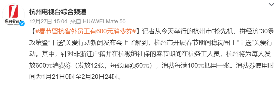 据悉,为鼓励和倡导省外员工春节期间留杭稳岗,助力企业复工达产,杭州将向每名春节期间留杭的省外员工(在杭缴纳社保的非浙江户籍员工)发放600元消费券。
