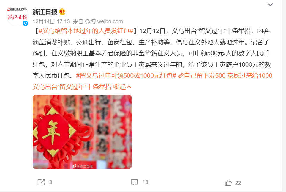 12月12日,义乌出台“留义过年”十条举措,在义缴纳职工基本养老保险的非金华籍在义人员,可申领500元/人的数字人民币红包。