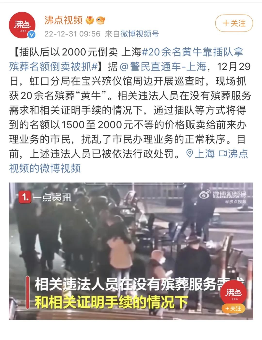 上海警方抓了20余名殡仪馆的黄牛,去殡仪馆也要插队,以前听说黄牛多是在倒卖火车票,或者医院的专家号,万万没想到,2022年的最后一天,殡仪馆也有黄牛,魔幻不?
