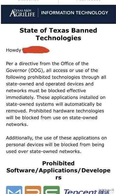 文章简介:近日,在某个华人论坛上,一名用户分享了一条消息:得州农工大学(Texas A&M University,简称TAMU)的学生收到了IT部门的通知,学校颁布“禁令”,所有国有和国营的设备及网络均禁止使用[db:内容简介]