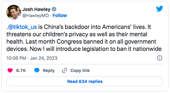 路透社报道,霍利他在推特上说,“TikTok 是中国进入美国人生活的后门。它威胁到我们孩子的隐私和心理健康”,他还强调, “现在我将立法在全国范圍内禁止它”。