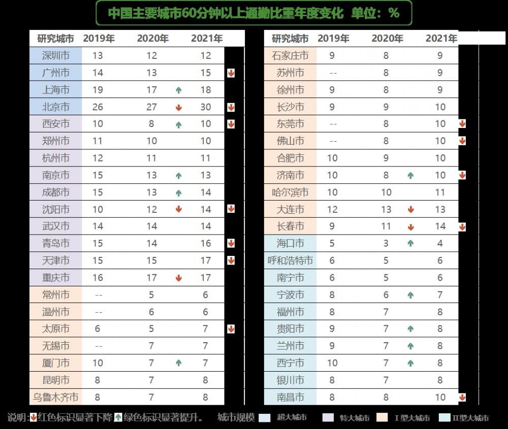 《报告》显示,2021年,各城市“幸福通勤”比重全线下降,主要城市“幸福通勤”人口比重总体平均水平为51%,同比降低2%。其中,超大城市48%,同比降低1%;特大城市49%,同比降低2%。