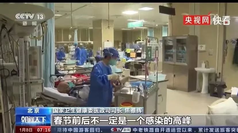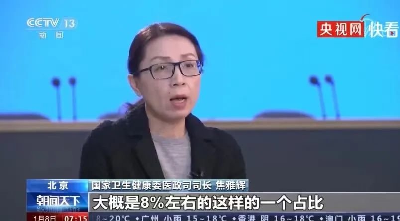 1月8日,在开放将近一个月时,国家卫健委医政司司长焦雅辉在接受央视采访中,透露2022年中国奥密克戎临床病例的分型情况,普通型占比大概8%。普通型就是有肺炎。媒体将此概括为“中国阳后出现肺炎人群约为8%,二级以上医院的重症床位使用不到80%。”