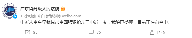 2月22日晚,广东高院官微回应此事称,申诉人李奎星就其弟李四强犯抢劫罪申诉一案,已被受理,目前正在审查中。
