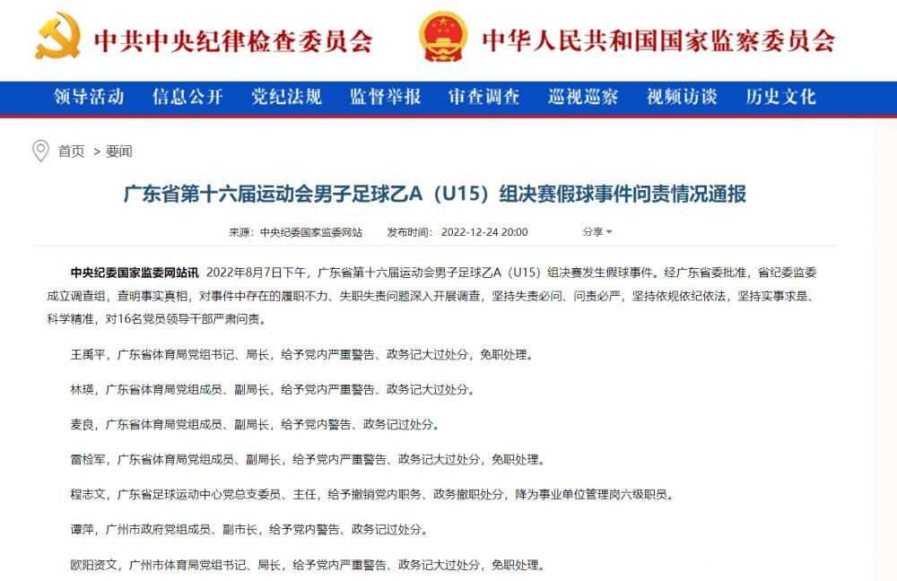结果4个多月后,中央纪委国家监委网站先公布了处理结果:16名党员领导干部被严肃问责,其中广东省体育局局长王禹平、广东省体育局副局长雷检军、广州市体育局局长欧阳资文、清远市文体局党组书记许广勇、清远市文体局副局长蔡发明、广州市足协主席谢志光更是被直接免职处理。