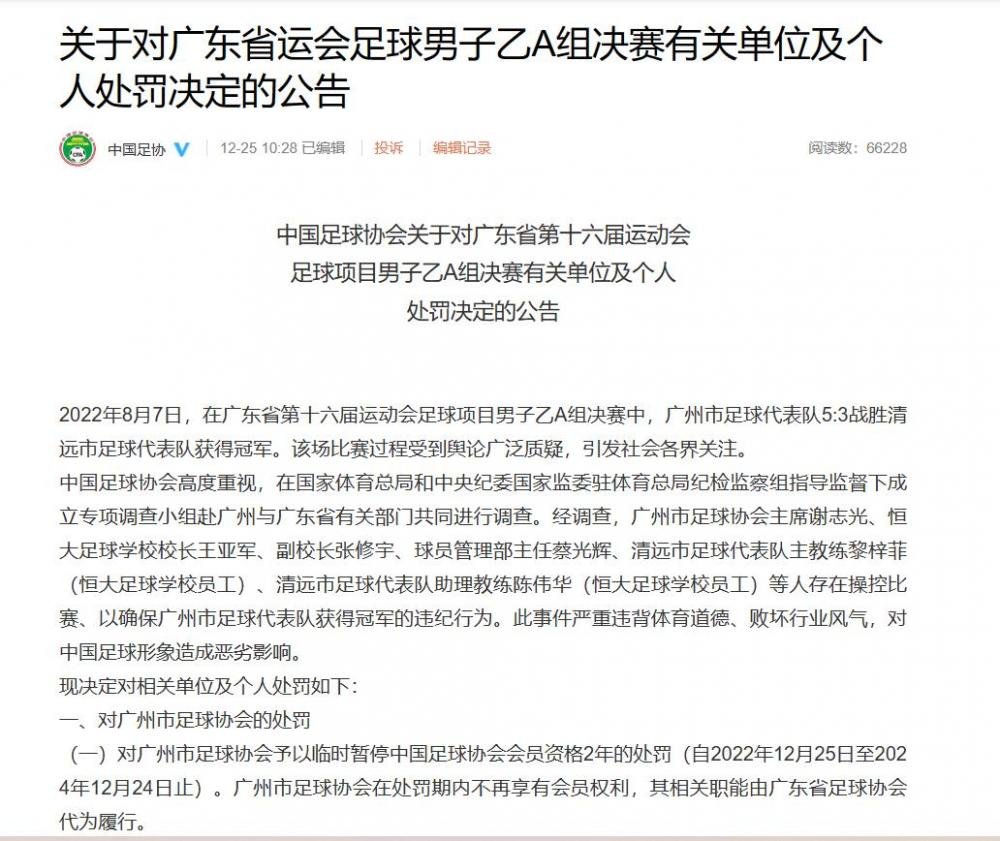 随后中国足协也公布了处罚决定:广州市足协主席谢志光、恒大足校校长王亚军、恒大足校副校长张修宇、恒大足校球员管理部主任蔡光辉被终身禁止从事足球活动;清远市足球队主教练黎梓菲(恒大足校员工)、清远市足球队助理教练陈伟华(恒大足校员工)被终身禁止从事足球活动,同时被取消了教练员资质。