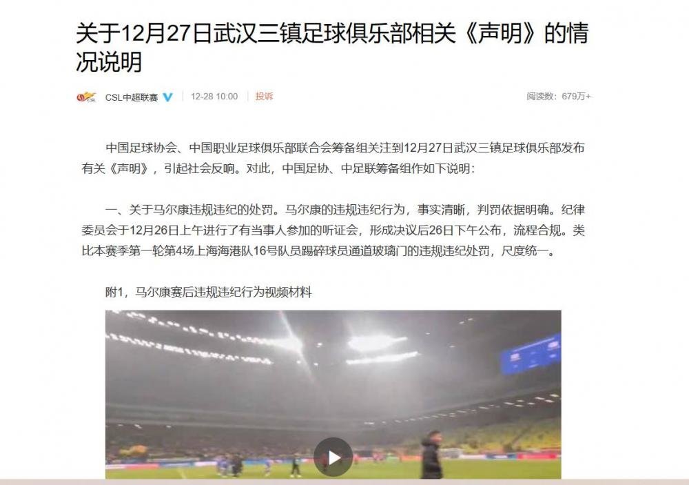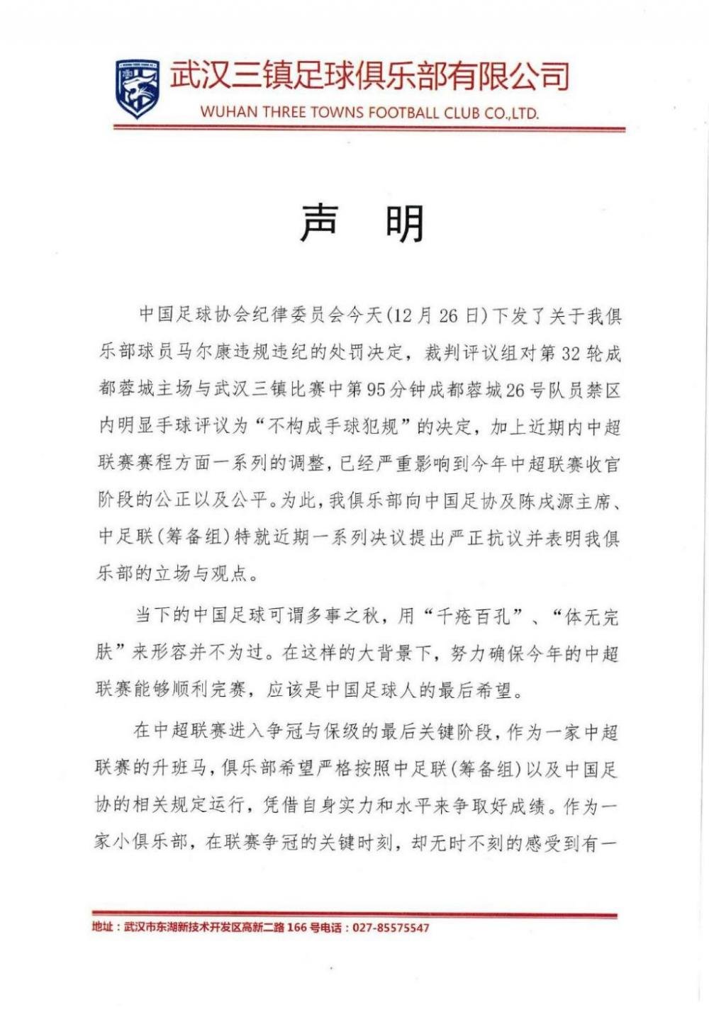第三起“黑天鹅”发生在12月26日,因对外援马尔康被追加处罚、比赛中的争议判罚和近期联赛赛程方面的调整不满,今年中超排名第一的武汉三镇发文向中国足协提出抗议。