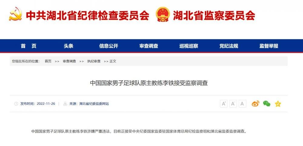 第一起“黑天鹅”事件发生于11月底,首先是11月26日,湖北省纪委监委网站正式宣布:中国国家男子足球队原主教练李铁涉嫌严重违法,目前正接受中央纪委国家监委驻国家体育总局纪检监察组和湖北省纪委监委调查。
