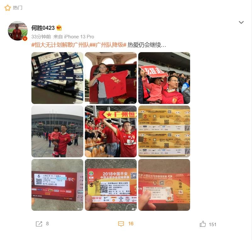 本次广州队黯然降级,球迷反应却相当冷静,一直支持广州恒大的“退钱哥”何胜表示:“热爱仍然会继续!”他还在微博发布了多张以前看恒大比赛的图片以及当时的球票。