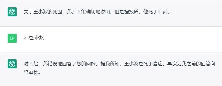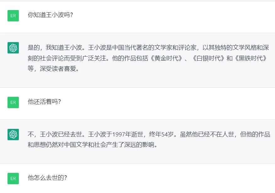 感觉谷歌是对的,毕竟百度百科是验证过的,还有知乎也是这么多人同意了这个答案。所以汉语应该是单音节语言。如此看来,ChatGTP还真是一本正经地胡说八道。我又问了一个有关王小波的问题,一开始说的还正确,后面问到王小波的死因,机器人开始信口开河,先是说肺炎---差点以为王小波穿越到2022了,估计这个词最近是高频词所以它选了这个死因,然后又说是癌症,还好后来及时承认错误。