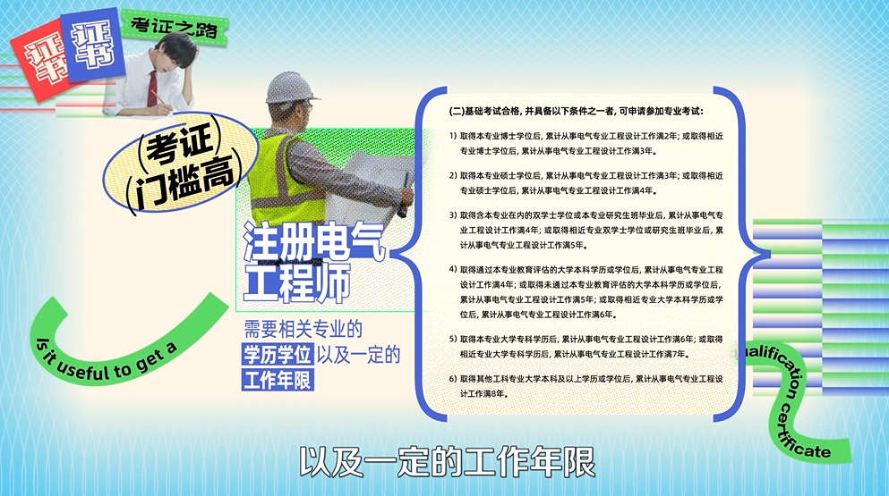 但这钱并没有这么容易能拿到。一方面,很多证的考证门槛很高,比如注册电气工程师,需要相关专业的学历学位,以及一定的工作年限。
