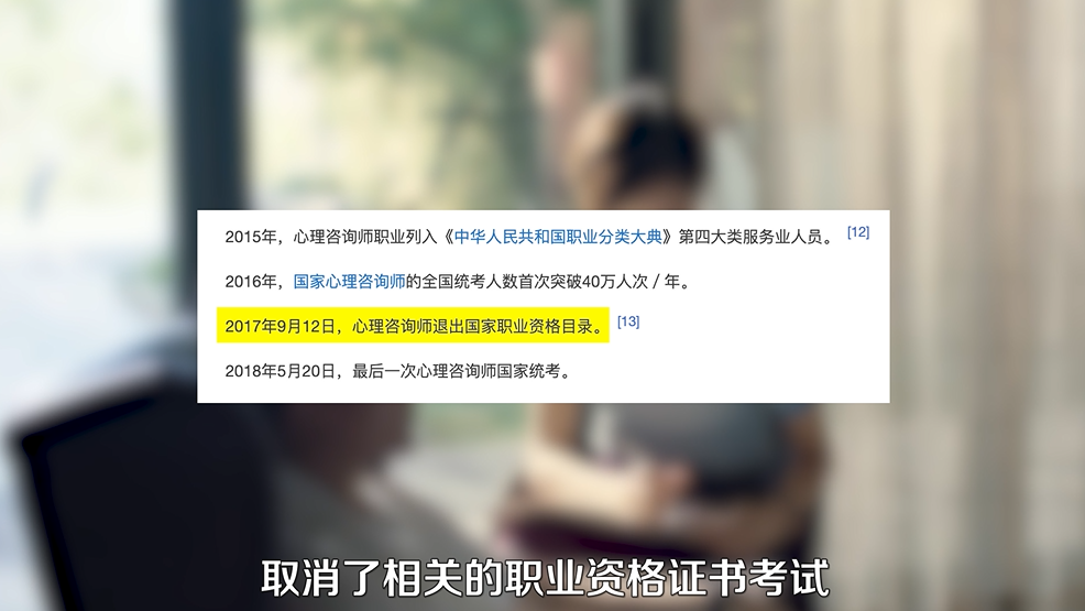 比如你肯定听过的“偷偷考个心理咨询师,惊艳所有人”,实际上,国家早在2017年就取消了相关的职业资格证书考试。目前市场上面向非专业人士的“心理咨询师证书”,都是各个机构自行颁发的,一些机构声称证书受“国家认可”,甚至“拿证即就业”,但实际情况却是2002~2017年间有150多万人考了国家心理咨询师证书,真正的从业人员却只有6000人。