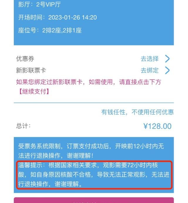 有网友反映,在新影联购票显示看电影需要72小时核酸,1月25日晚,健康时报记者在新影联公众号尝试购买电影票,在支付页面上的确有提示“观影需要72小时内核酸,如自身原因核酸不合格,导致无法正常观影,无法进行退换操作。”