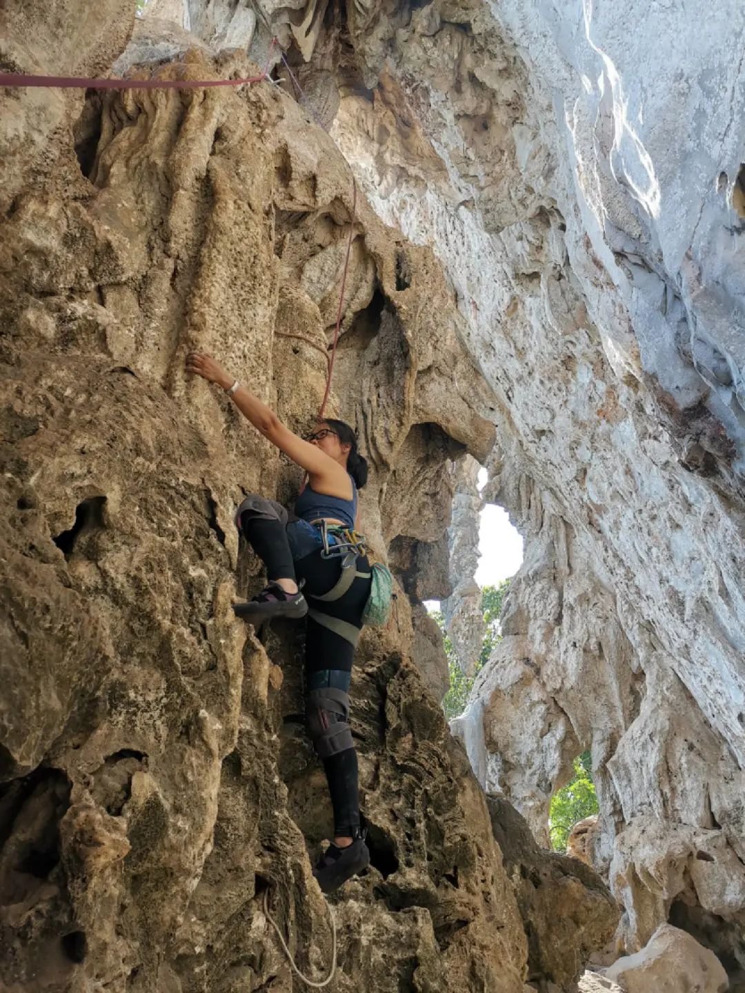 Dobie 在中国最大的岩壁 El Dorado(是西班牙语里“黄金之城”的意思)的一条运动攀线路上。图片来源:Chuang Liu