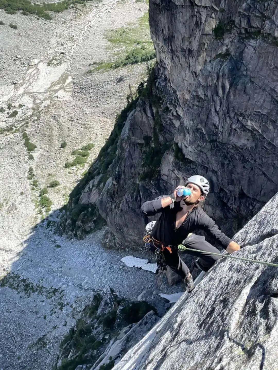 “在线路途中一块巨石横亘在你的头顶,岩石碎片掉进你的衣领,松动的岩石导致保护装置失效,常常让人惊出一身冷汗。依靠装备攀登不到一厘米宽的岩石裂缝,时间都在指尖处凝固了。”