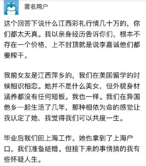 这名网友自称是上海“土著”中产,在美国留学时与一名来自江西萍乡的女留学生相识相恋,最终因结婚彩礼未谈拢分手。