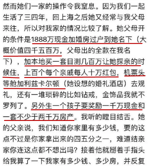 该匿名用户称,前女友的父母向他提出了1888万天价彩礼、数千万房产过户到女方名下、女方上百个亲戚每人给十万元红包等要求,他对此无法接受。