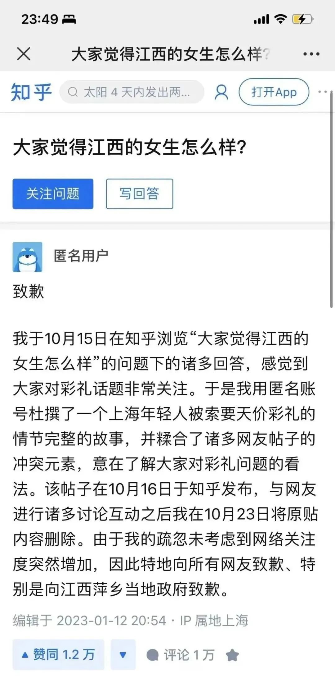 1月13日,知乎平台官方账号知乎小管家发公告称,第一时间进行了核查,相关内容出自某匿名用户于 2022年10月16日发布的回答。该回答于2023年1月12日被发布者修改为致歉声明,承认了杜撰事实。