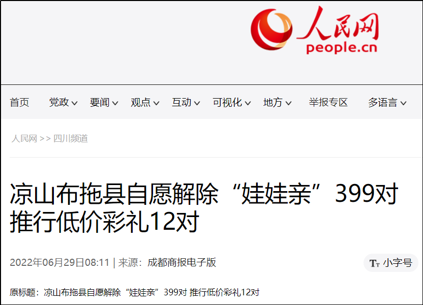 乌鸦找到了去年的一则官方报道,《凉山布拖县自愿解除“娃娃亲”399对,推行低价彩礼12对》,也就是说,“娃娃亲”这种封建陋习是自官方之口被证实的,确有其事。