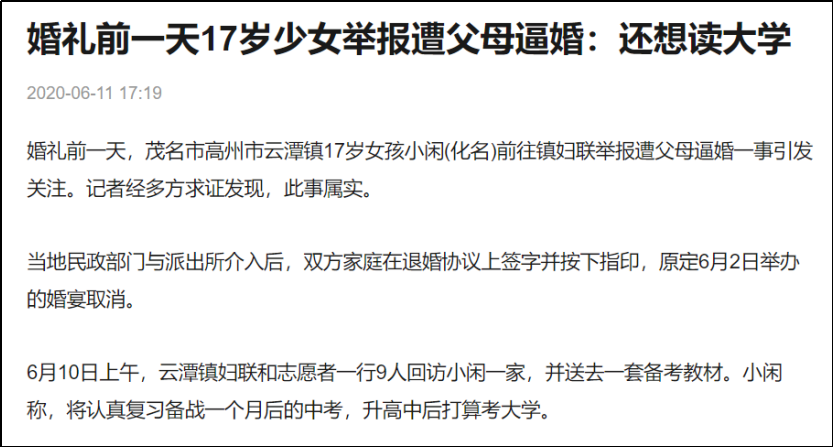 2020年,广东茂名高州云潭镇17岁女孩前往镇妇联“举报”其父母逼婚,称父母逼自己与见面仅6次的邻村22岁男子结婚。当地民政部门和派出所介入后,双方家庭同意退婚,女方家退还5万元彩礼,并取消了原定于6月2日的婚宴,重新返回校园。