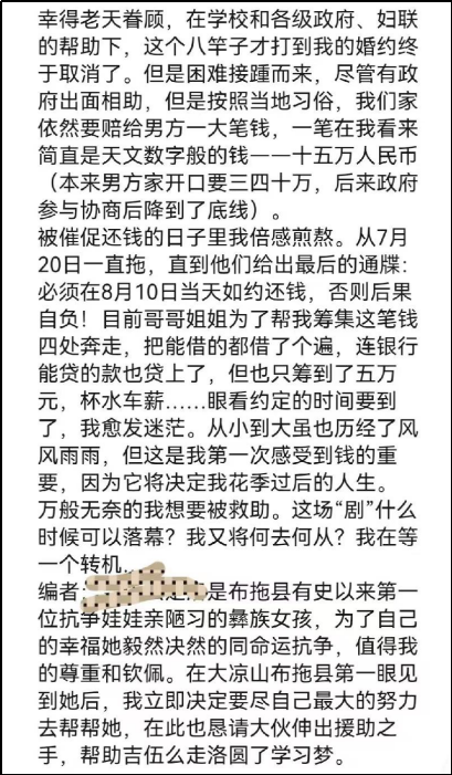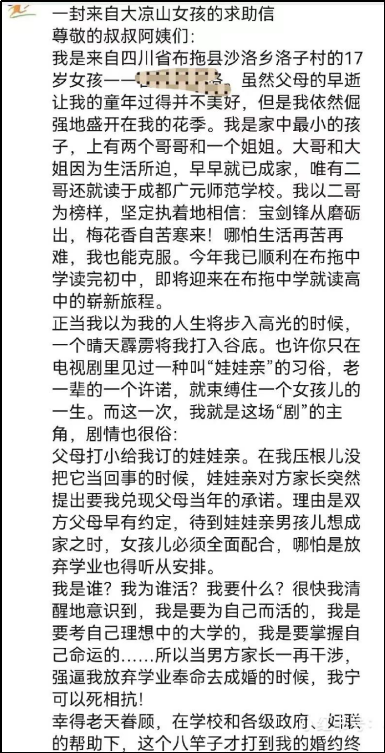 曾经网络上流传过一封大凉山女孩的求助信,一名17岁女孩为了摆脱“娃娃亲”,被男方要求赔一笔三四十万的“身价钱”,后来通过政府从中斡旋才讨价还价到了十五万,可见这吃人的陋习对女性的捆绑和束缚之深。