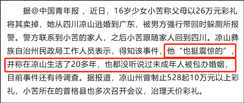 那位“在凉山生活了20多年都没听说过未成年人包办婚姻”的民政局工作人员,到底是自己脱离群众太久以至于孤陋寡闻,还是对这种广泛存在于凉山的陋习故意相隐不言,大家心里应该都有自己的判断。