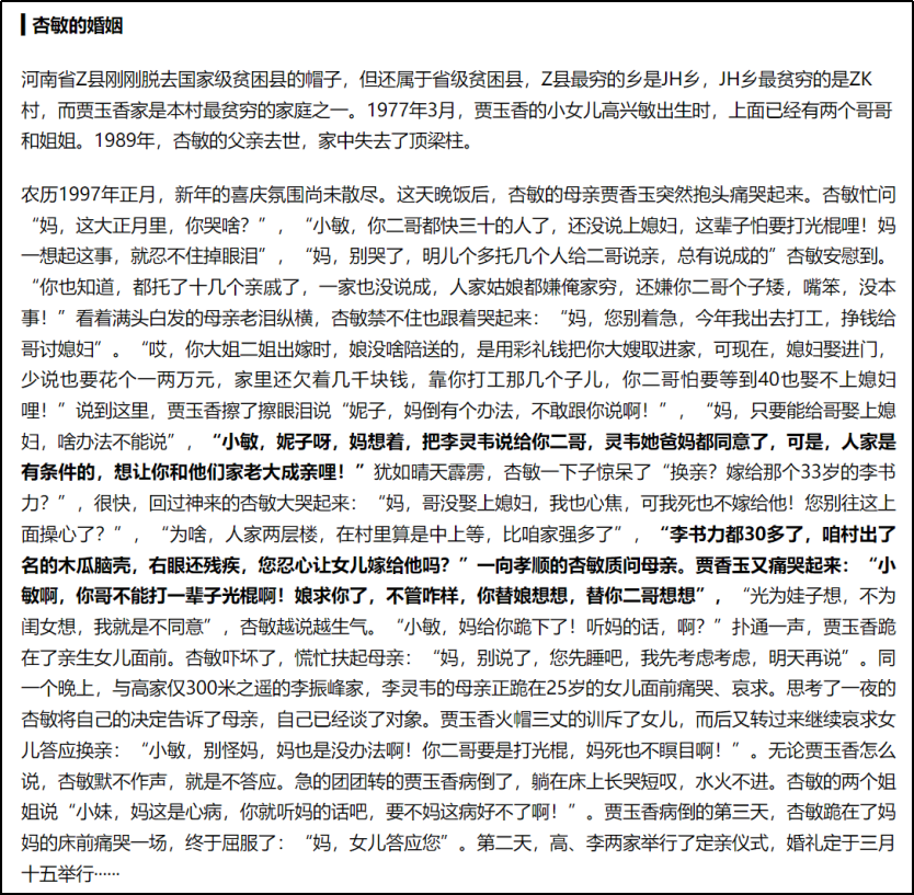 “换亲”和“转亲”作为一种封建陋习,已经存在数百上千年,其底层逻辑就是:男人用自己的姐妹来交换以得到妻子,是最廉价的娶老婆的办法。