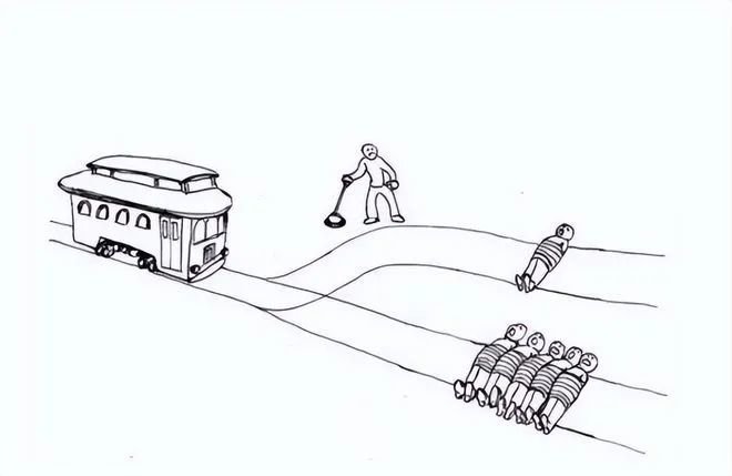 说一辆电车在轨道上行驶,在它前面的轨道上被绑着五个人,可是电车刚好失控了,停不下来,眼看就要把这五个人给碾死。