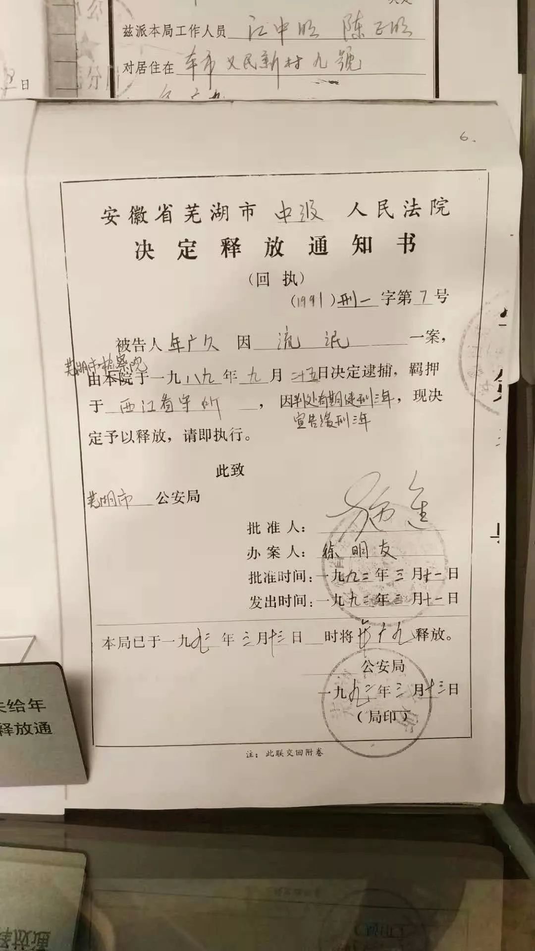 如果细心看年广九出现在媒体中的名字,不少人会很容易地发现其存在“年广九”与“年广久”的差别。而在“傻子瓜子博物馆”中,我们甚至看到他在1992年的“决定释放通知书”上,开头的“被告人”栏与结尾的“决定”中,出现了同一人的两种名字写法。