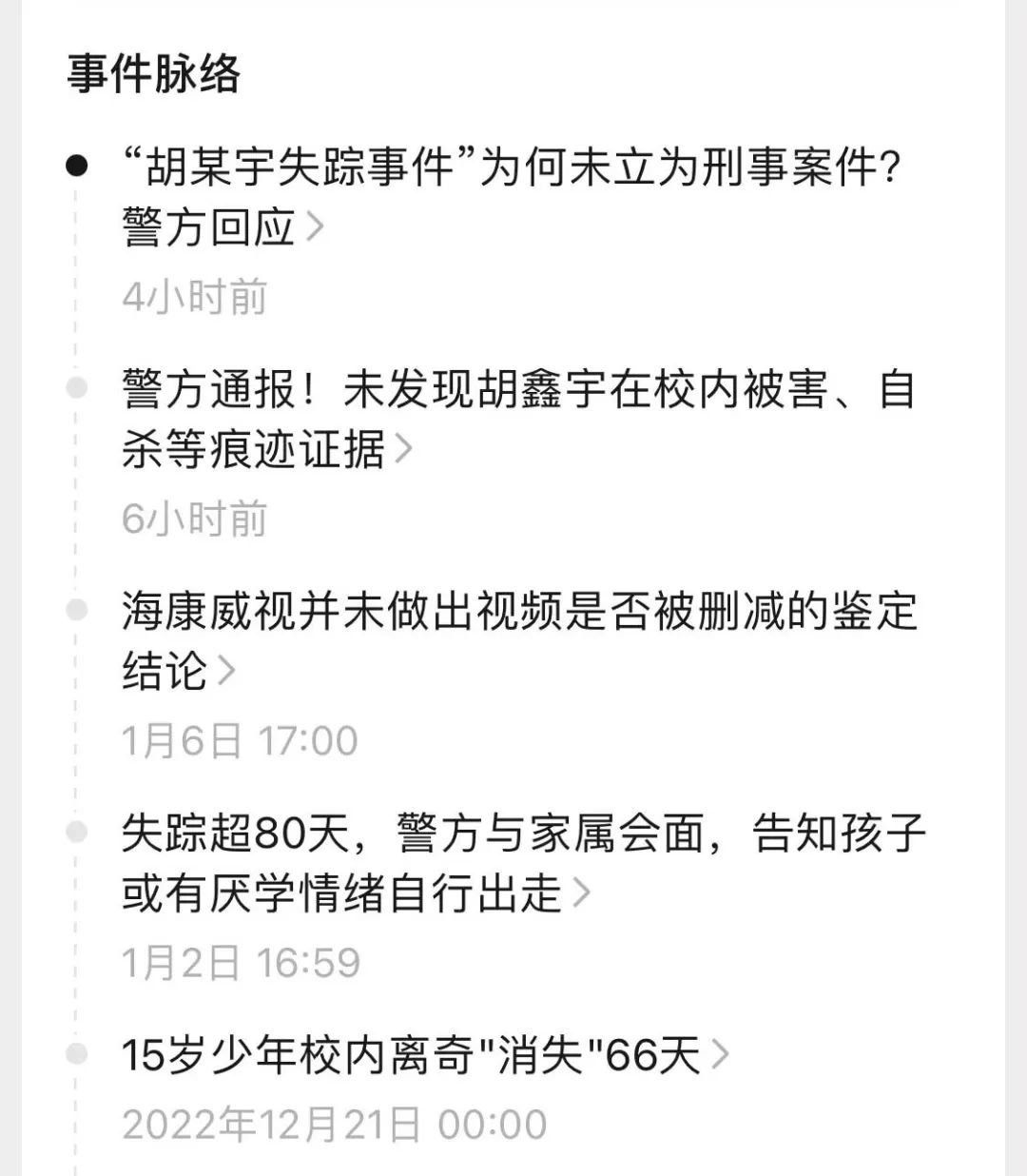 “未发现胡某宇在校内被害、自杀、发生意外的痕迹证据。综合现有信息指向胡某宇系自行离校,目前正在全力查找中。”