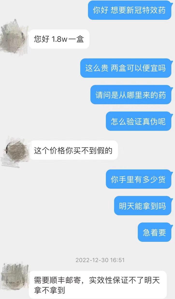 这段时间,通过各种渠道找黄牛花花买药的人增多。花花自称从美国购入Paxlovid,从印度购入其仿制药。至于行情,正价2300元的Paxlovid被炒至13000元一盒,仿制药则为4000元一盒。每天找她买药的人太多,“排完单已经累得不行,再不快点都没货了。”