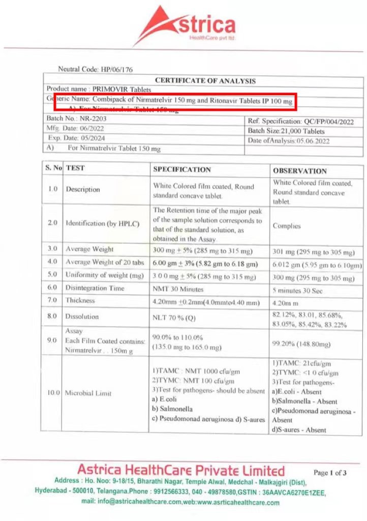 primovir是印度 Strica制药仿制辉瑞的Paxlovid ,有效成分与之相同。