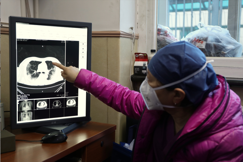 24日,北京中医医院重症医学科宋麦芬主任正在查看新冠患者肺部CT片。