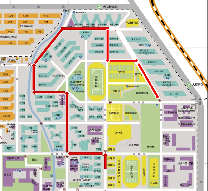 为减少同学步行、骑车压力,送站专线设置校内和双清公寓上车点供同学候车。校内上车地点位于紫荆操场和网球场中间的新民路。