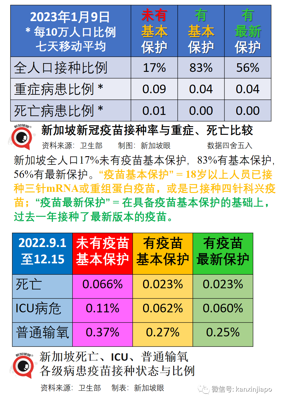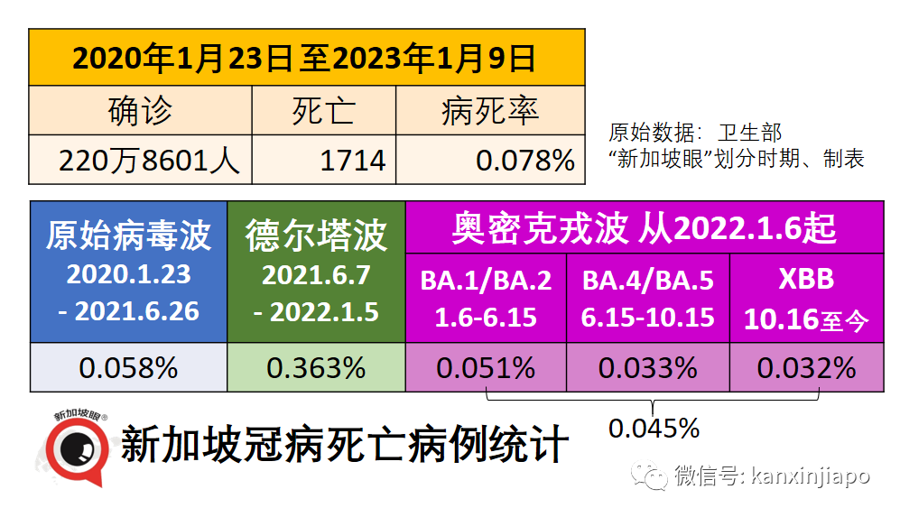 新加坡原始病毒波的病死率为0.058%,德尔塔波为0.363%,奥密克戎波为0.045%。在奥密克戎当中,自10月中旬至今的XBB波的病死率为0.032%。以上划分是“新加坡眼”按时期粗略划分,仅作参考。