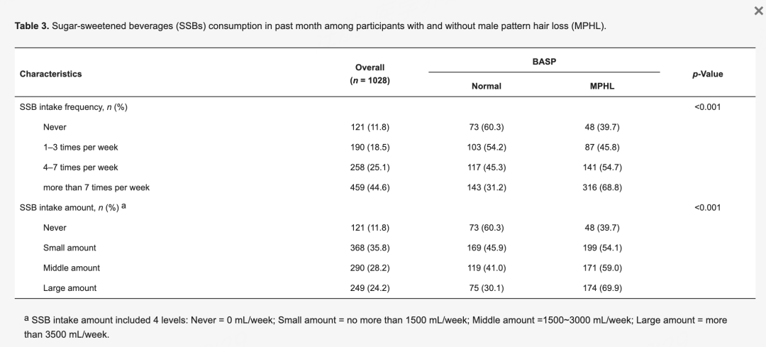 调查表明,有44.6%的参与者频繁饮用含糖饮料(>7次/周),存在男性型脱发的参与者在饮用频率和饮用量方面,都比未脱发者更高。