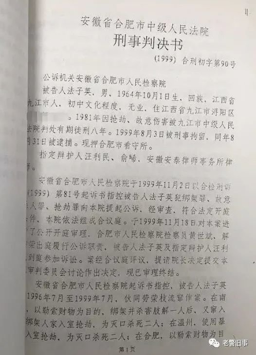 合肥市中级人民法院判决书显示:法子英,男,回族,1964年10月1日生,江西省九江人,初中文化程度,无业,住江西省九江市浔阳区,1981年因抢劫、故意伤害被九江市中级人法院判处有期徒刑8年。