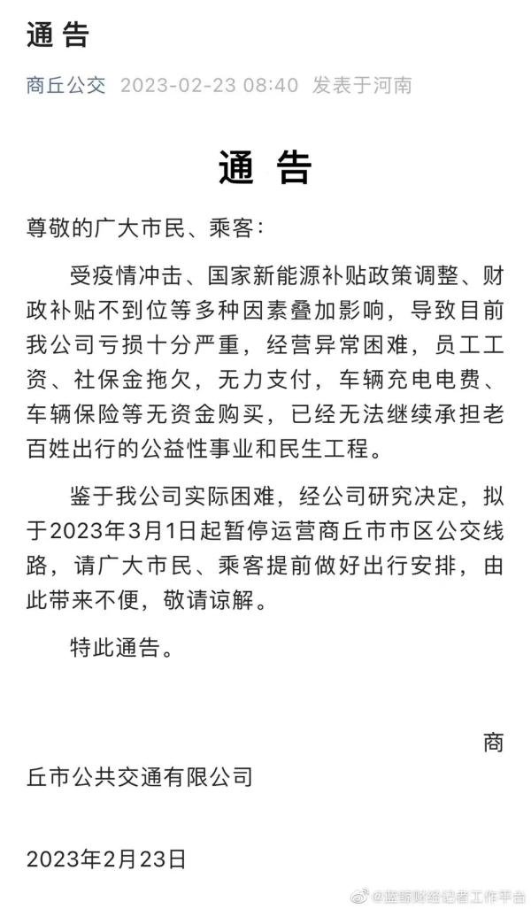 2月23日,河南商丘市公共交通有限公司发布通告,因亏损十分严重,经营异常困难,拟于2023年3月1日起暂停运营商丘市市区公交线路。商丘是河南省市区人口超过百万的五座城市之一,如果真的停运将影响百万市民的便利出行。