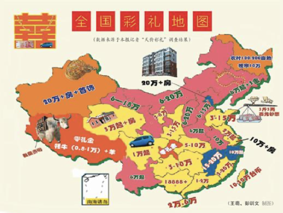 翻开全国彩礼地图,江西几十万的彩礼水平赫然在目。然而哪怕是中国经济第一大省的广东,彩礼水平也不过是1到2万。