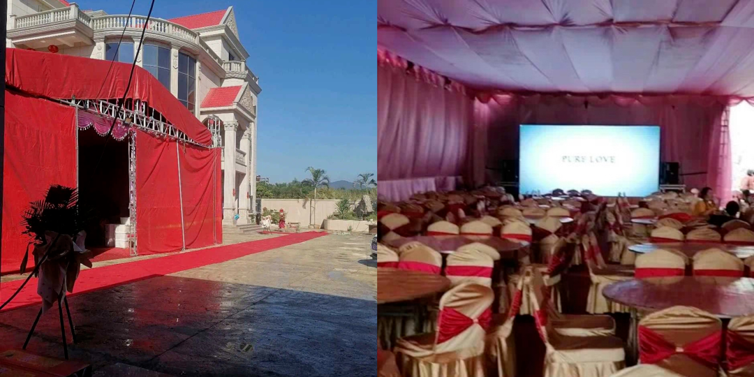 举办地就是在自家大院子里,搭起红色雨棚,里头还有空调、电子大屏、KTV