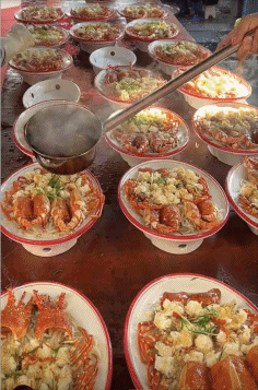 对比他在老家吃到的一些预制菜八宝饭,这里的龙虾、鲍鱼、海参、海蟹、花螺、石斑鱼都是上一秒刚出锅,又鲜又热。