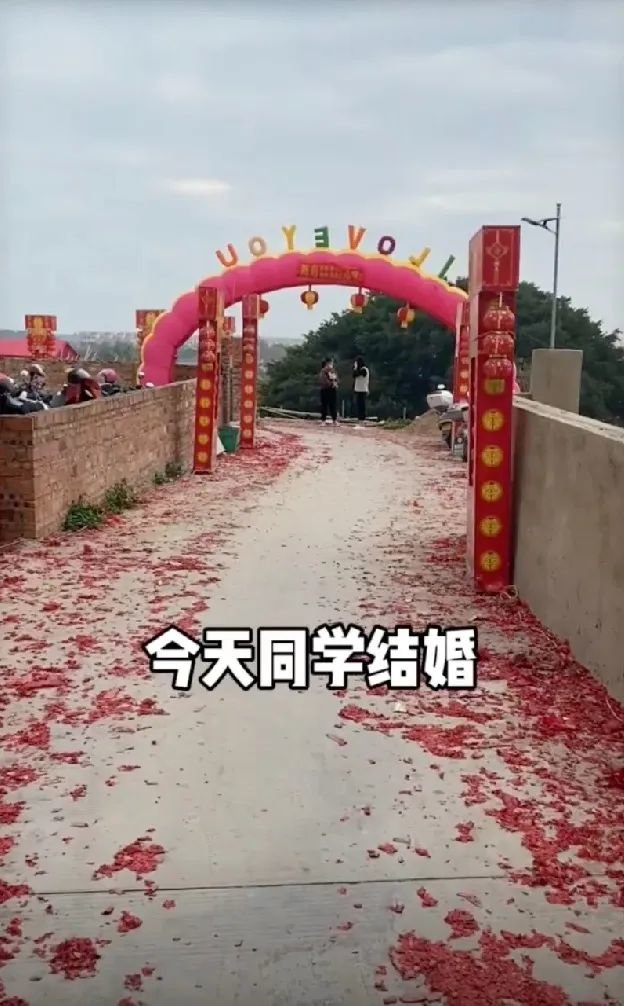 妈见喜的大红灯笼,充气红拱门上“I LOVE YOU”的字样,伴随震耳欲聋、连十里外的土狗都能被一秒锤醒的大炮仗……
