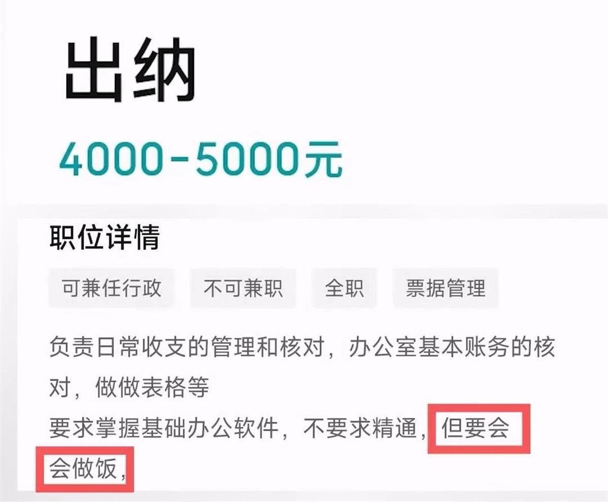 2月23日,有网友反映,江西南昌一家企业招聘出纳,竟要求应聘者会做饭。相关截图显示,这一岗位负责日常收支的管理和核对、办公室基本账务的核对、做做表格等,对基础办公软件只求掌握无需精通,但要会做饭,薪资为4000至5000元。